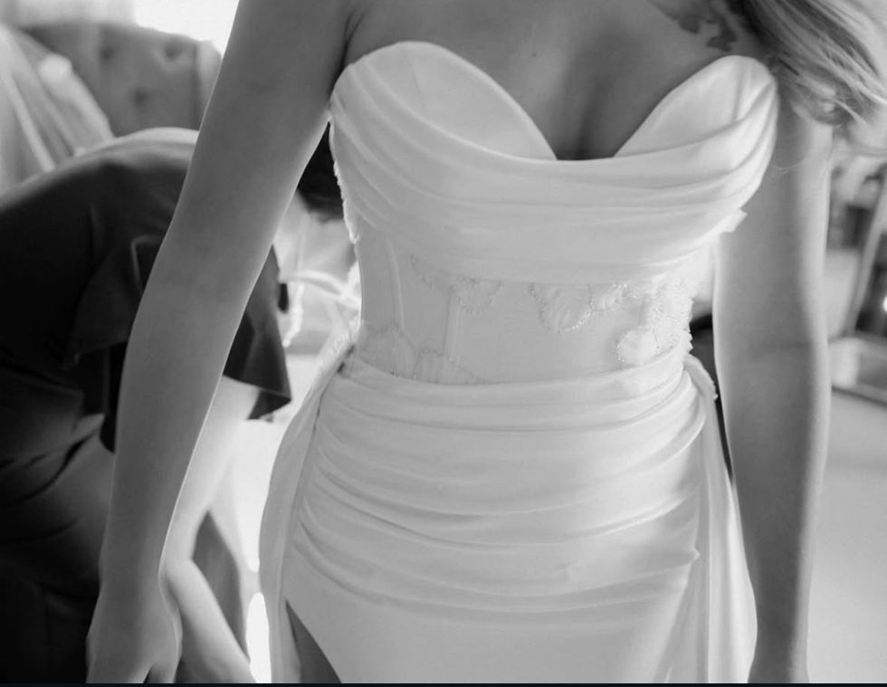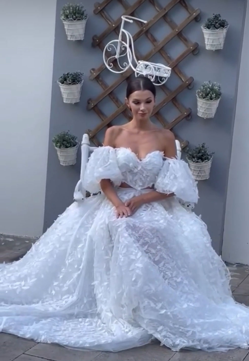 This project showcases a variety of elegant bridal gowns, including lace, strapless, and off-shoulder designs. The images feature brides in different settings, such as descending a staircase, sitting on a bench, and walking down a city street.